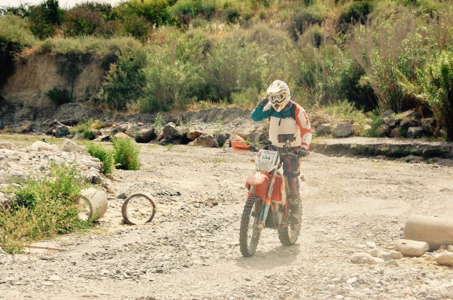 Se habían desarrollado ya dos de las tres etapas de la prueba y cuando discurrían unos 55 kilómetros de la última etapa en la mañana del domingo cual fue la sorpresa que nos encontramos. En la entrada de un camino un señor bastante irritado con escopeta en mano nos decía que no nos atreviéramos a pasar, que se trataba de un camino privado y que no podíamos seguir adelante con la prueba. Al principio pensamos que se trataba de una broma digna de un Western típico almeriense, pero el mal humor del señor nos hizo entender que debíamos parar las motos de inmediato.
